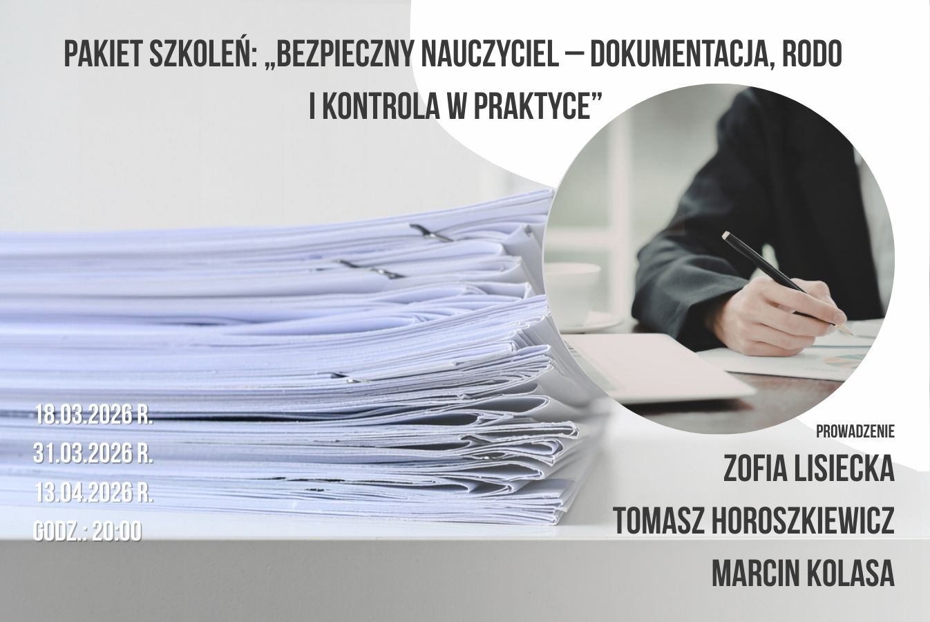 Szanowni Państwo, zapraszamy Państwa na pakiet szkoleń online „Bezpieczny nauczyciel – dokumentacja, RODO i kontrola w praktyce”, który pomoże nauczycielom, edukatorom i wszystkim pracującym w